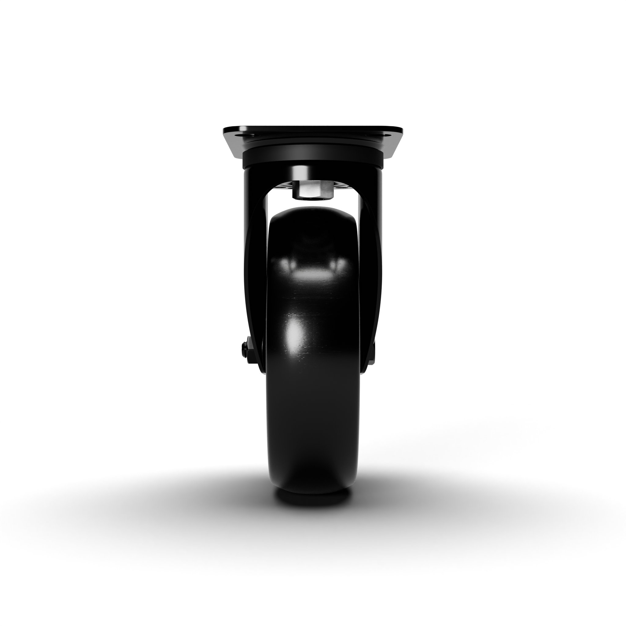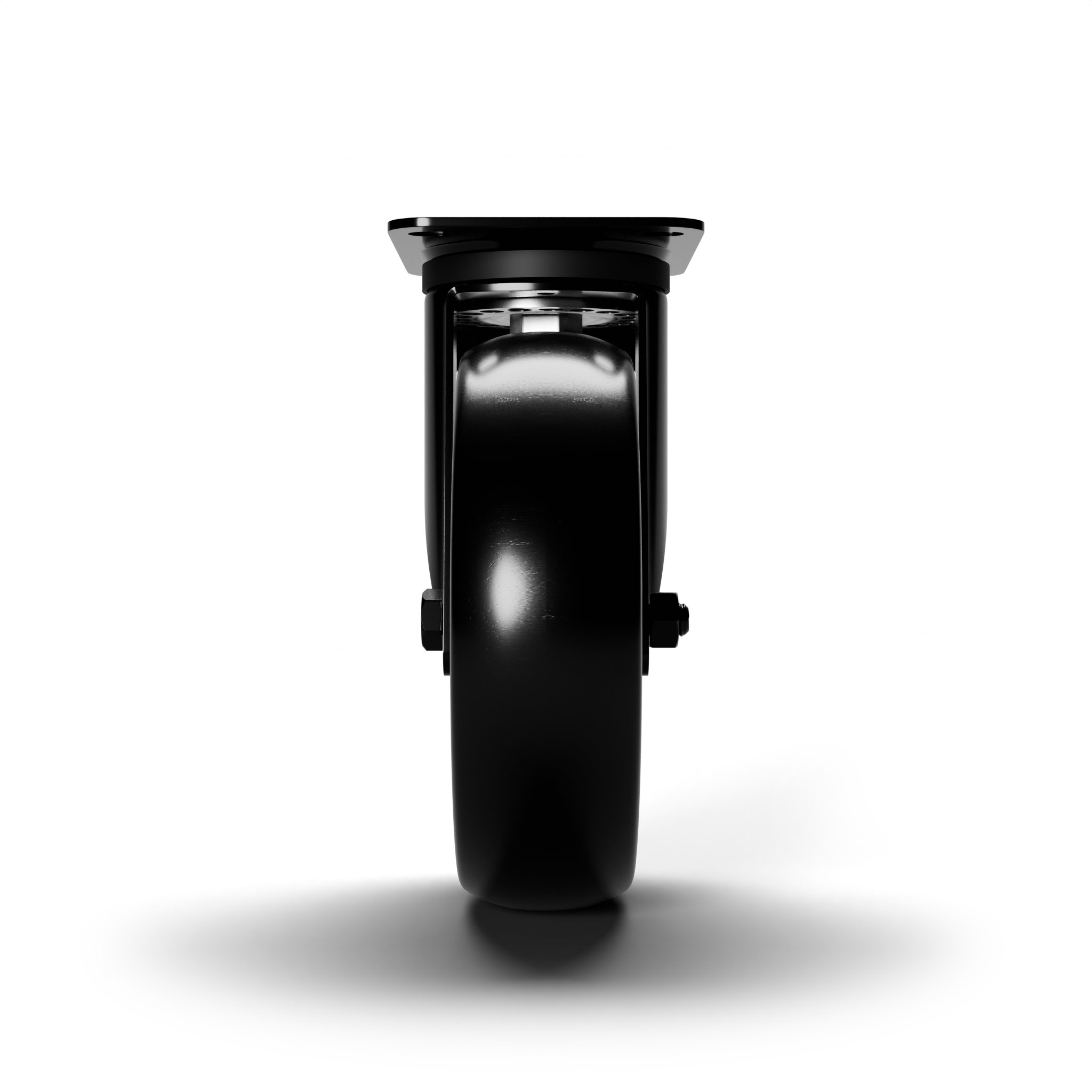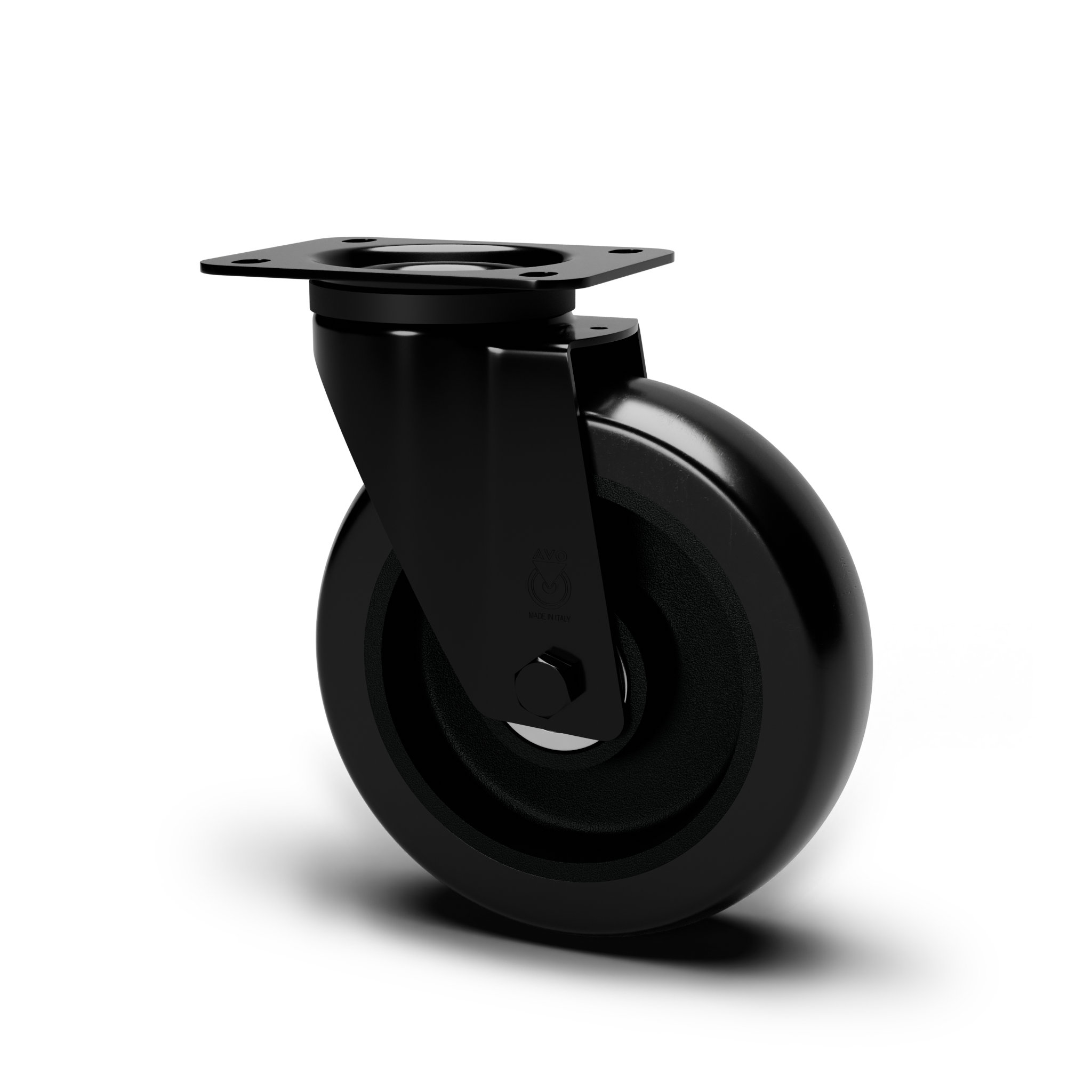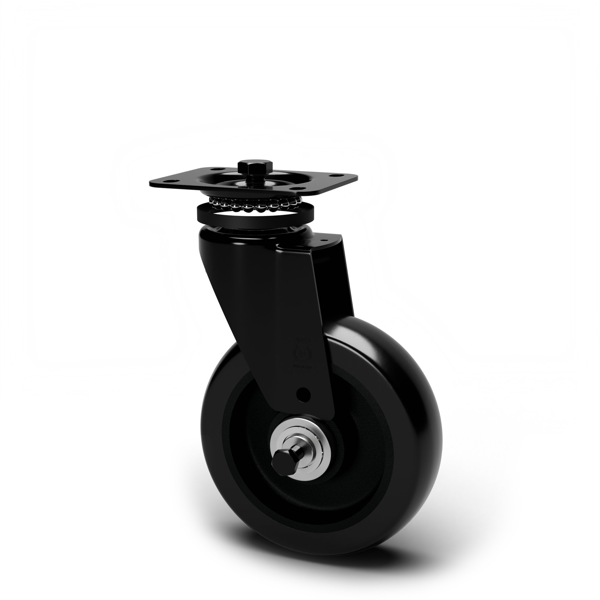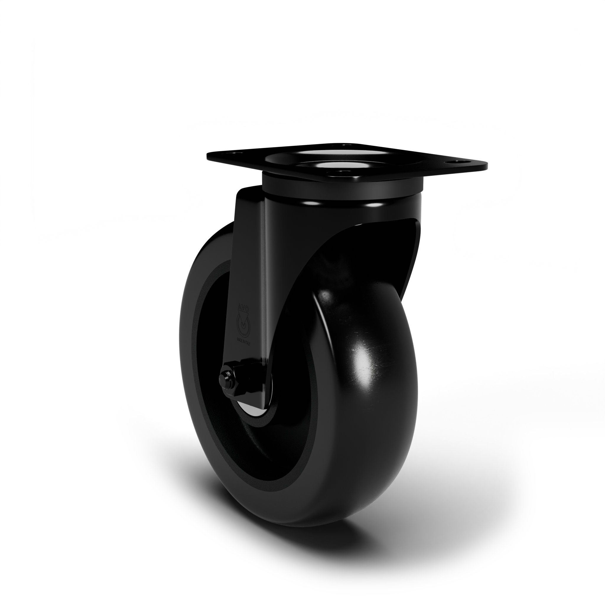 Wheel coated with cast black rounded polyurethane tread AVOLAN 91 Shore A and black matte aluminium centre. Quiet, robust and discreet, ideal for stage and theatre equipment. Hub on shielded ball bearings assembled with central spacer.