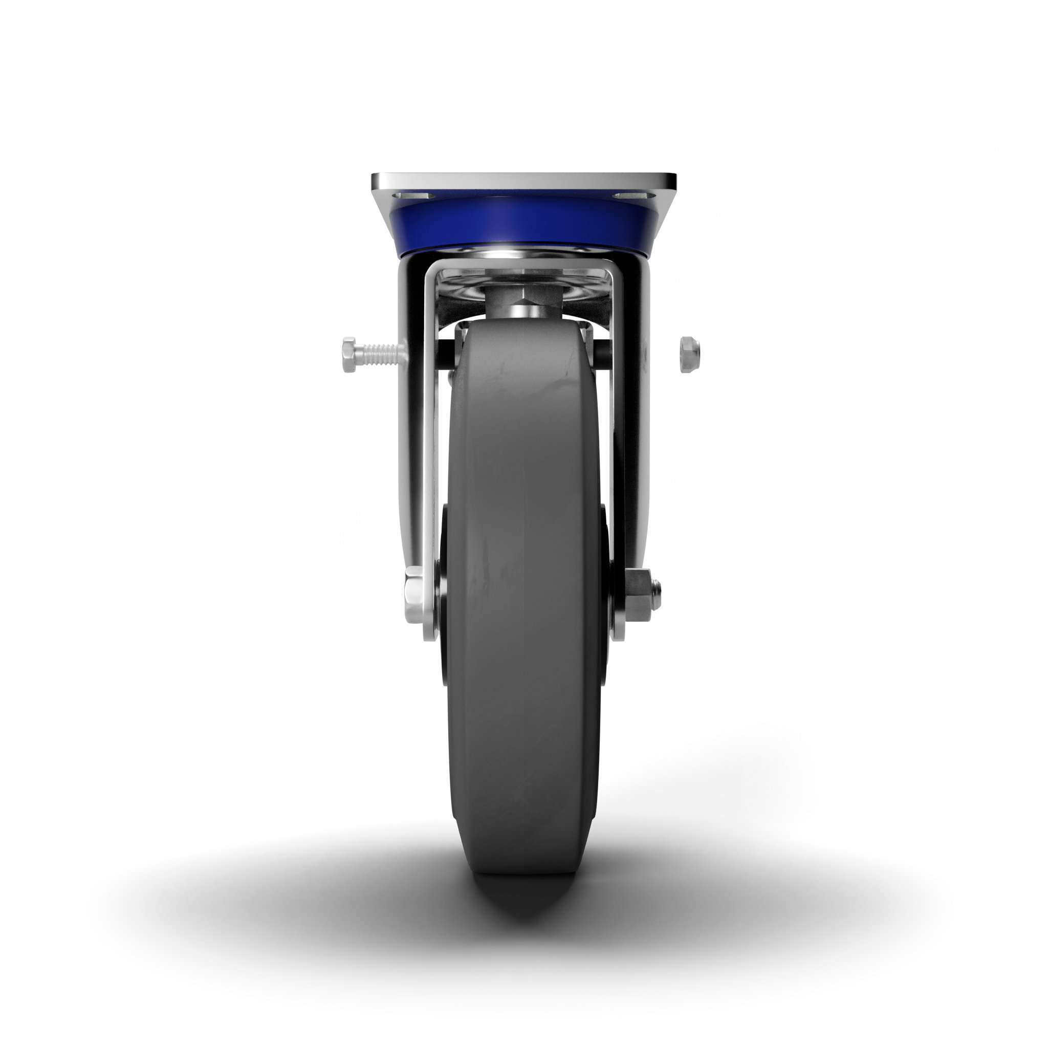 Wheel with elastic grey non-marking rubber tyre 68 Shore A and Polyamide 6 centre. Hub on stainless steel roller bearing, shielded stainless steel ball bearings assembled with central spacer.