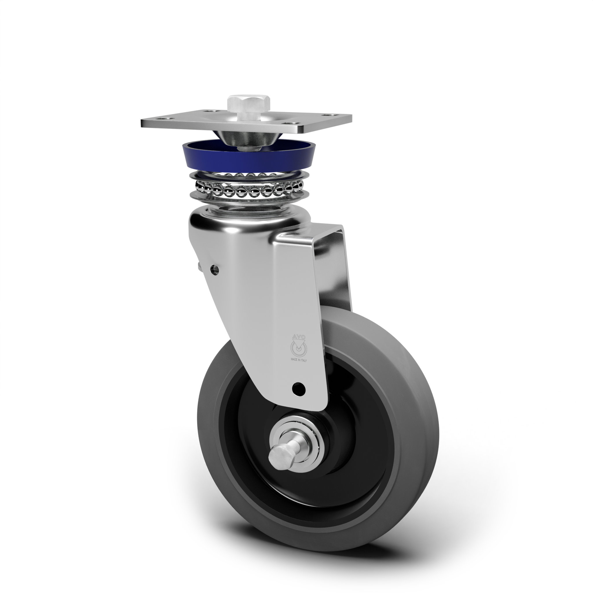 AVO – Wheel with non-marking rubber tyre and aisi 304 stainless steel castor for industry, diameter 125mm ean 25122