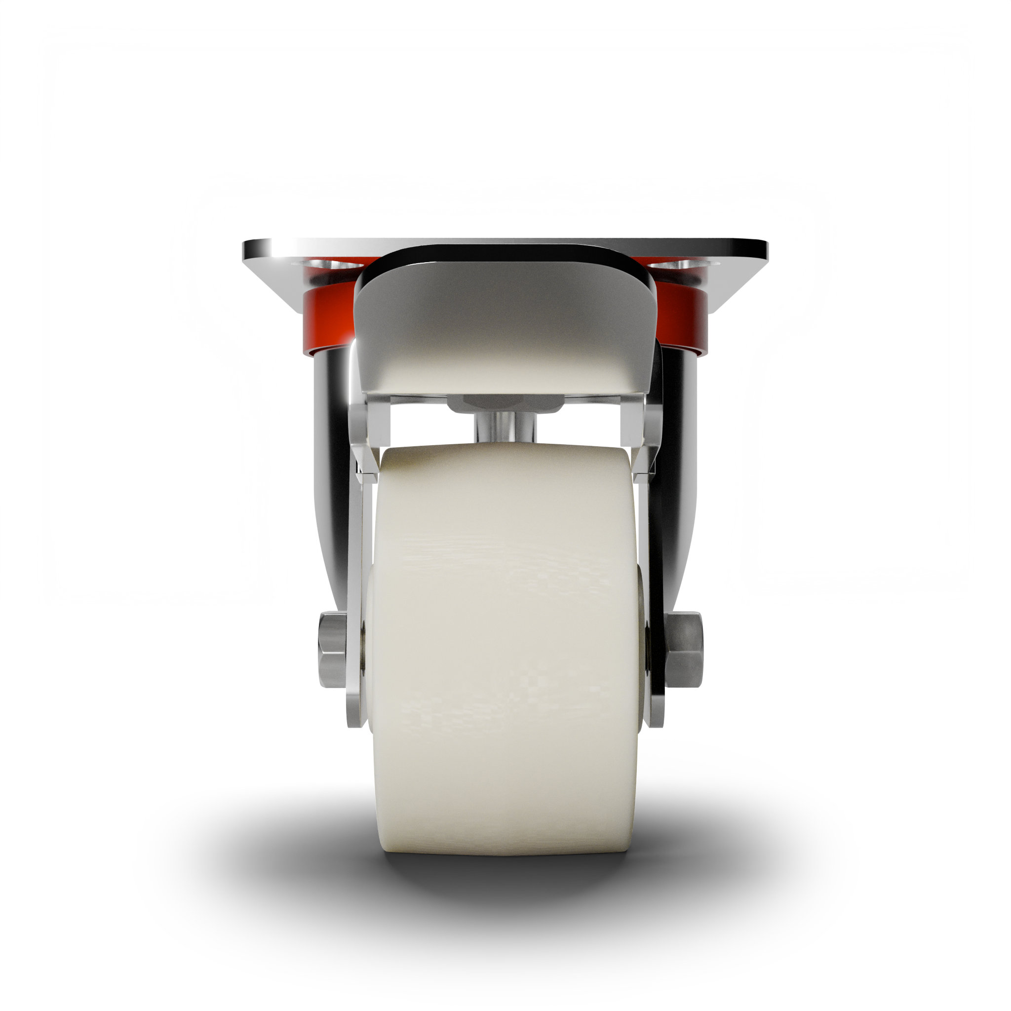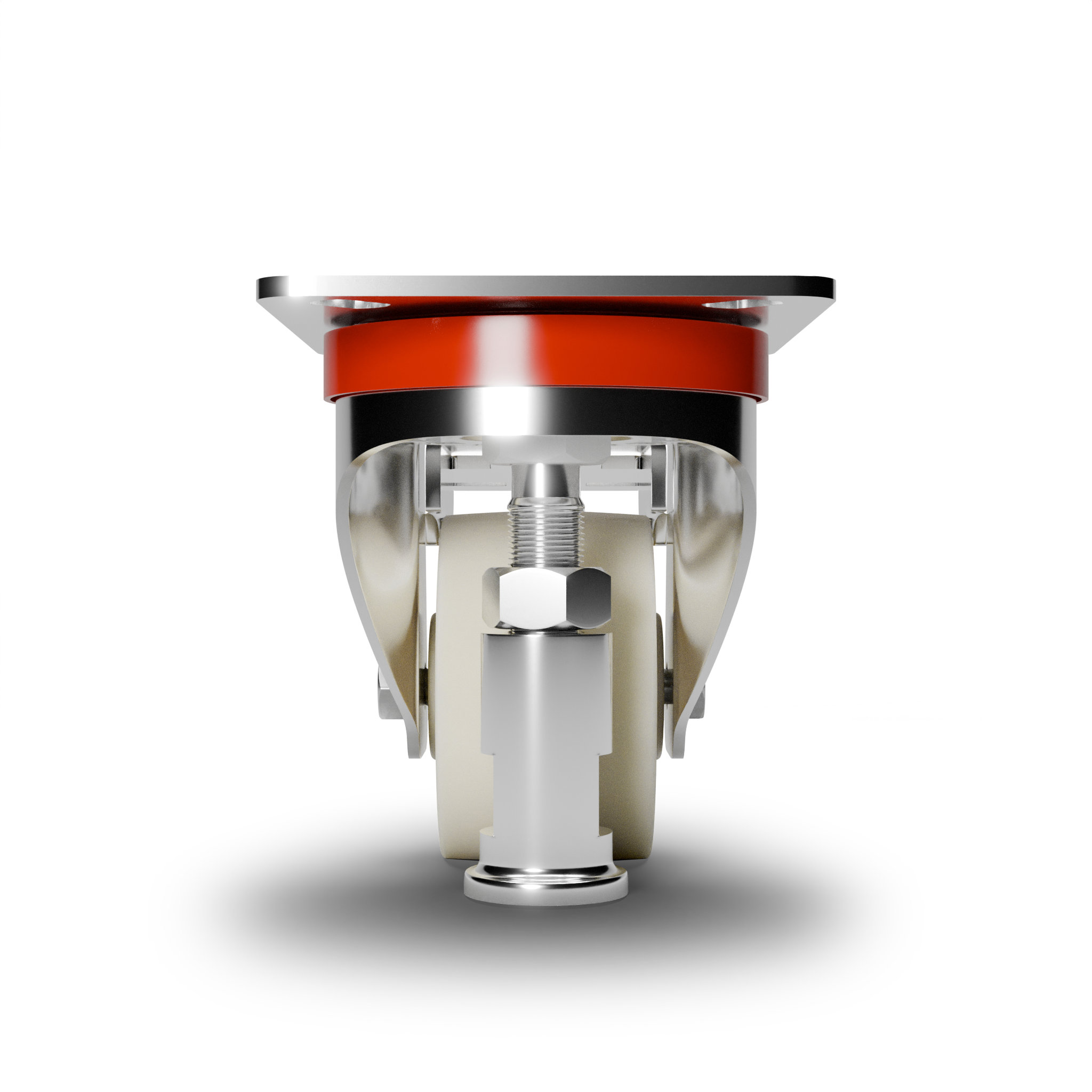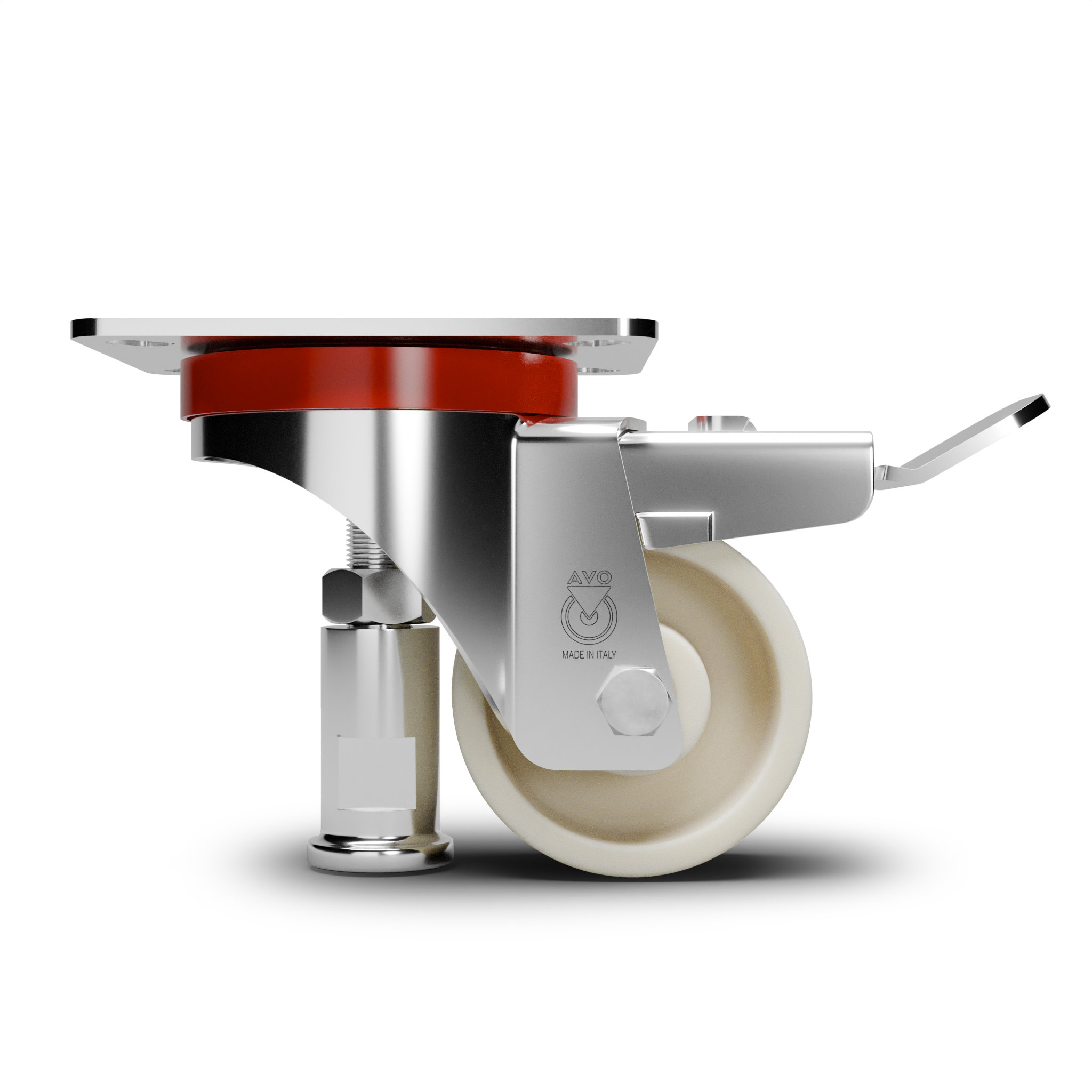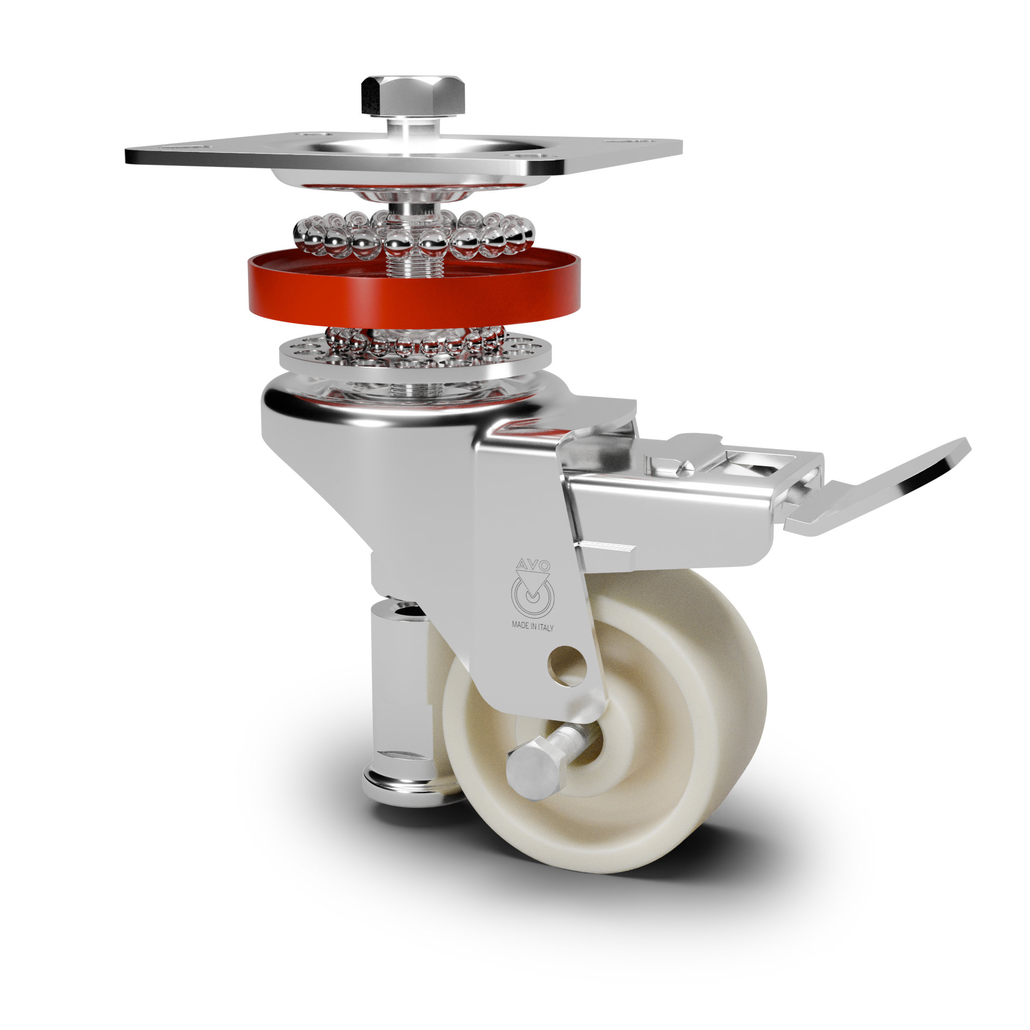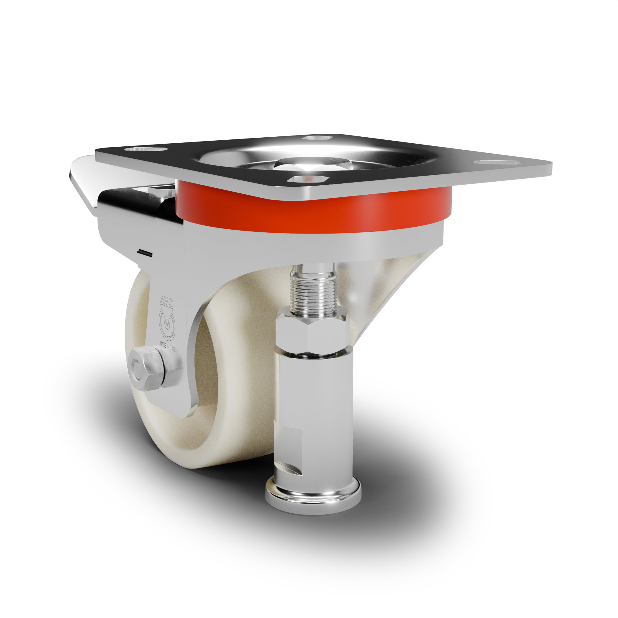 En acero estampado zincado-cromado, giratorio sobre doble hilera de bolas, con placa, pata niveladora ajustable y freno delantero. Montado con tuerca autoblocante y anillo protector antipolvo sobre las bolas.