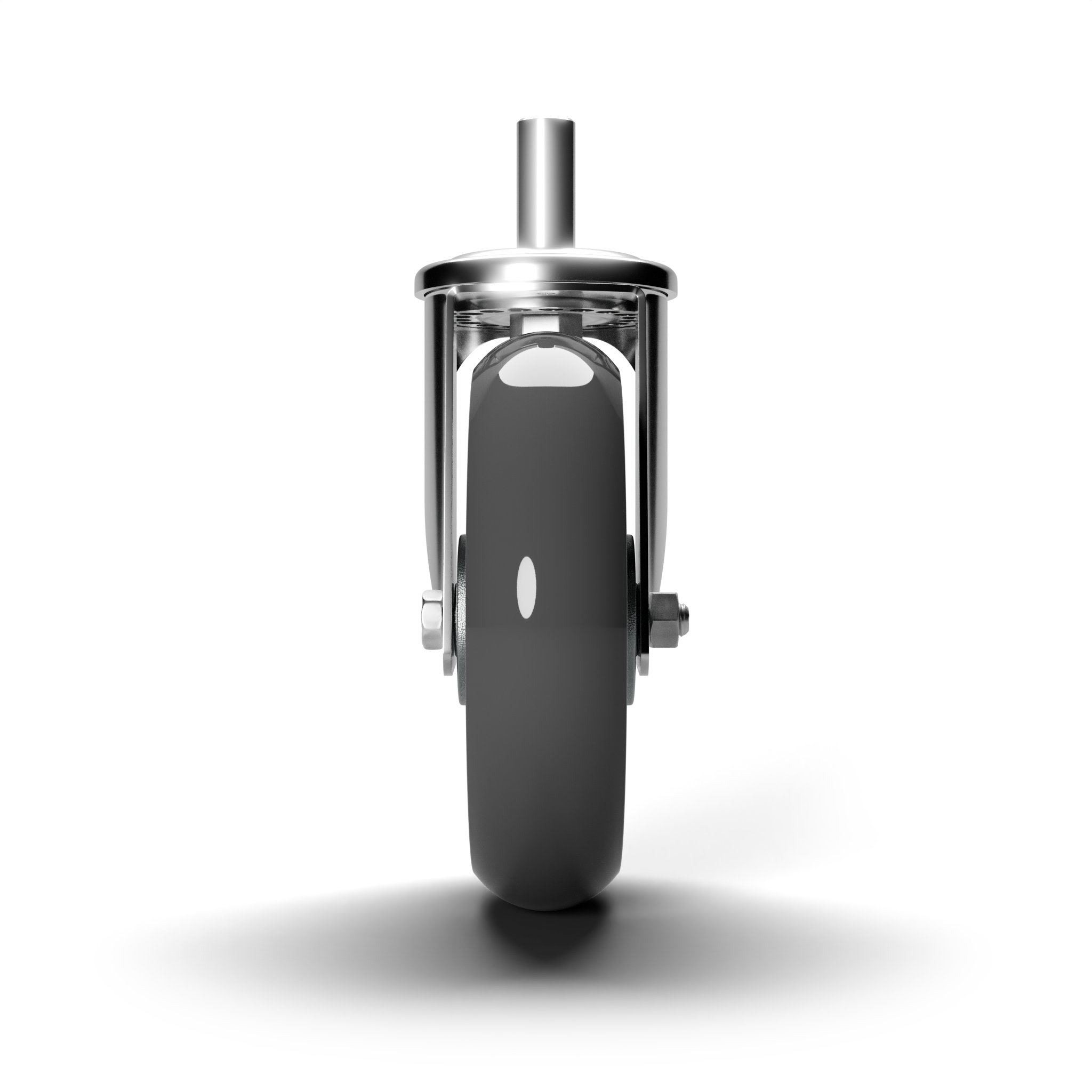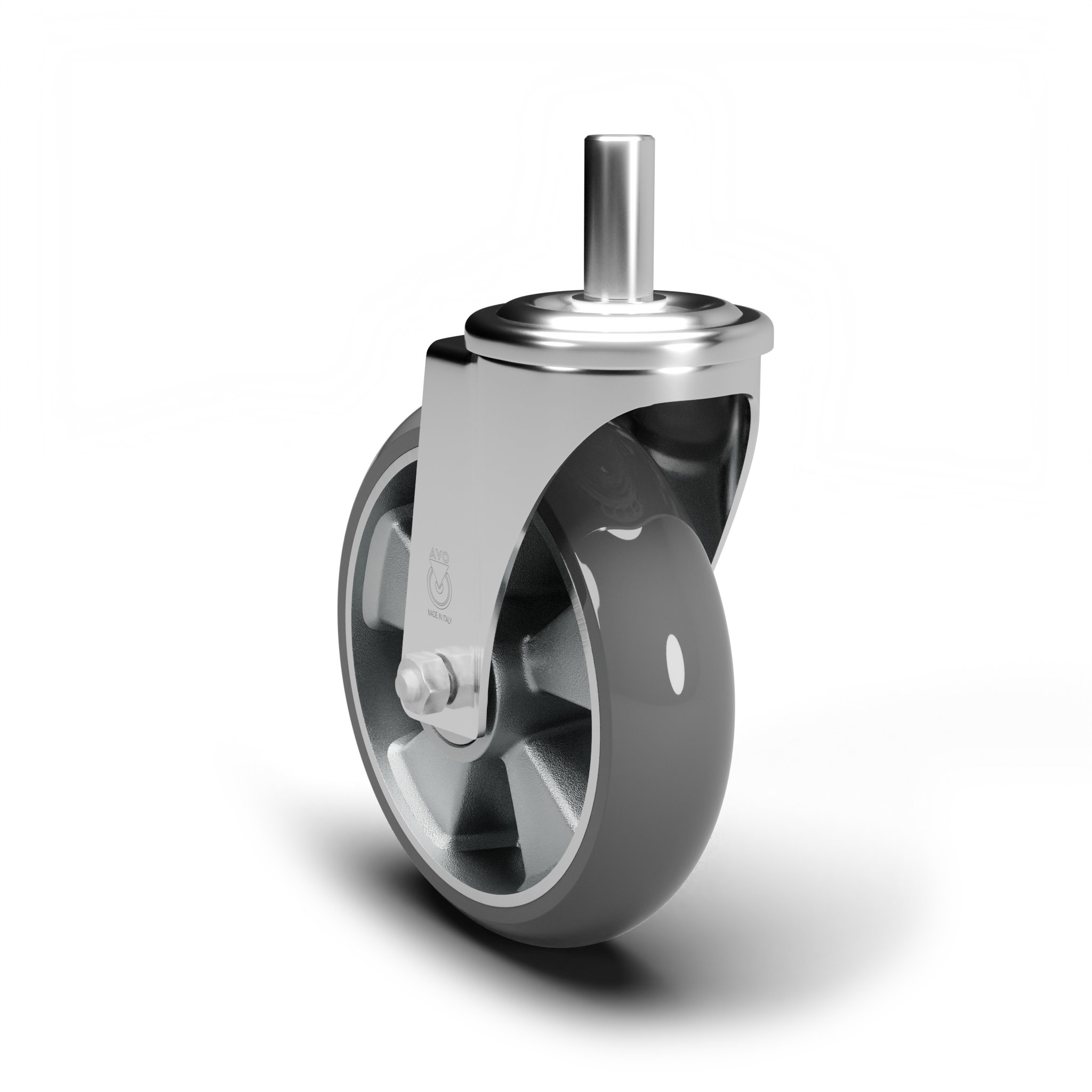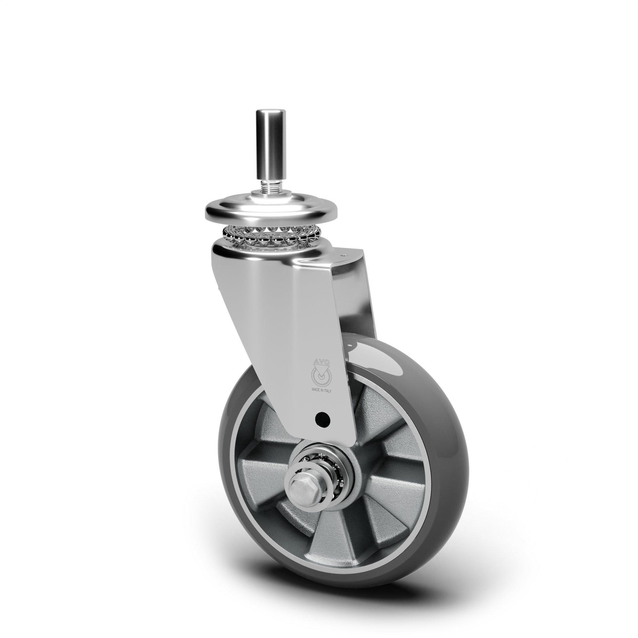 En acero estampado con recubrimiento cincado-cromado, giratorio sobre doble hilera de bolas, con espiga. Montaje mediante tuerca autoblocante.