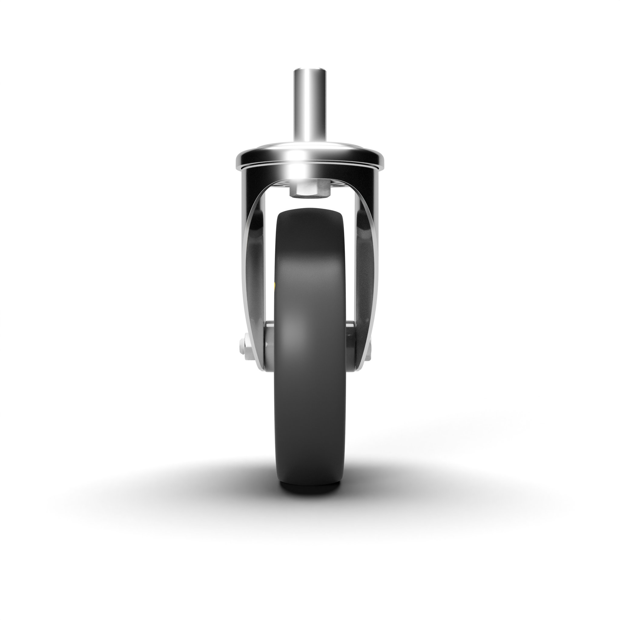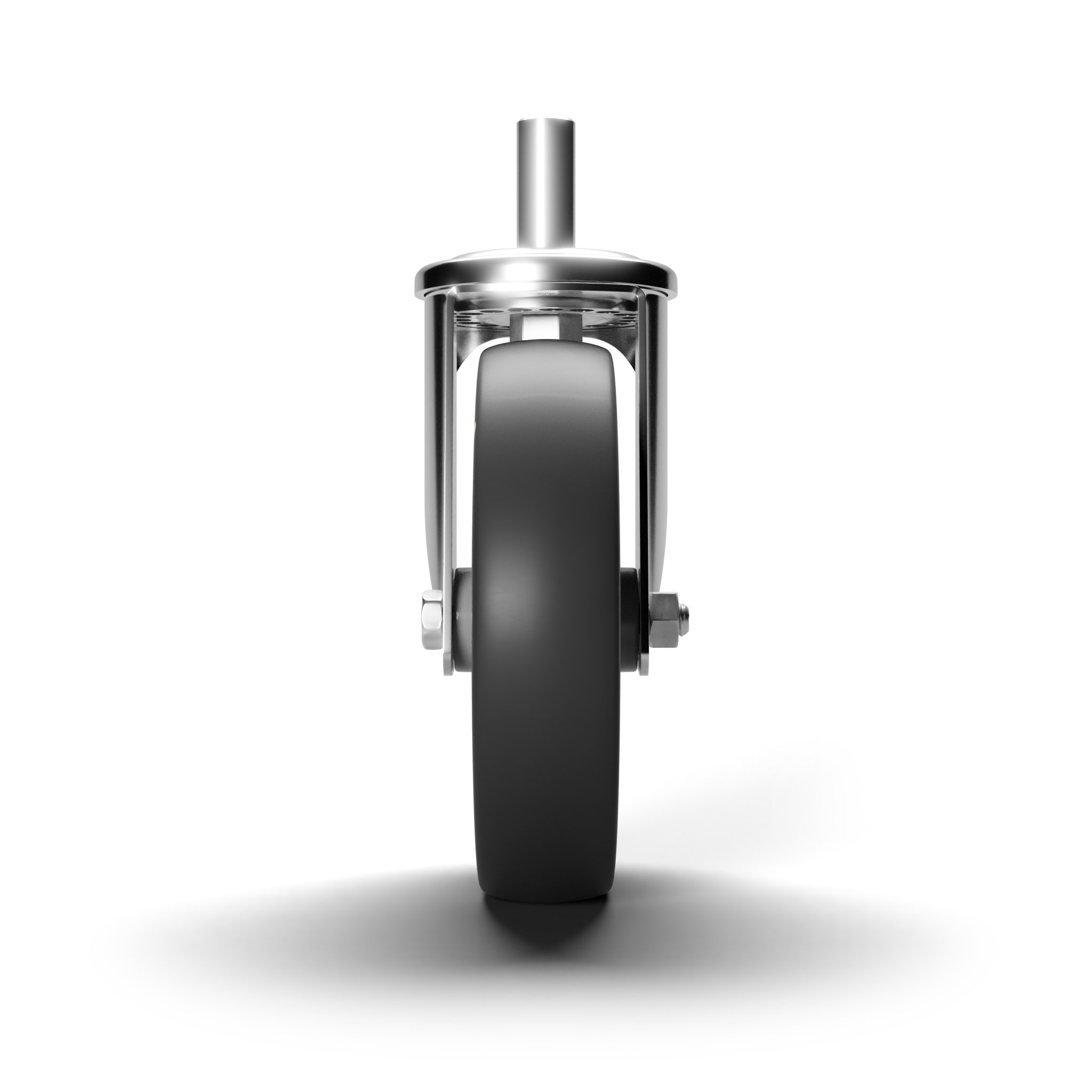 In acciaio stampato zinco-cromato rotante su doppia corona di sfere, con perno. Assemblaggio con dado autobloccante.