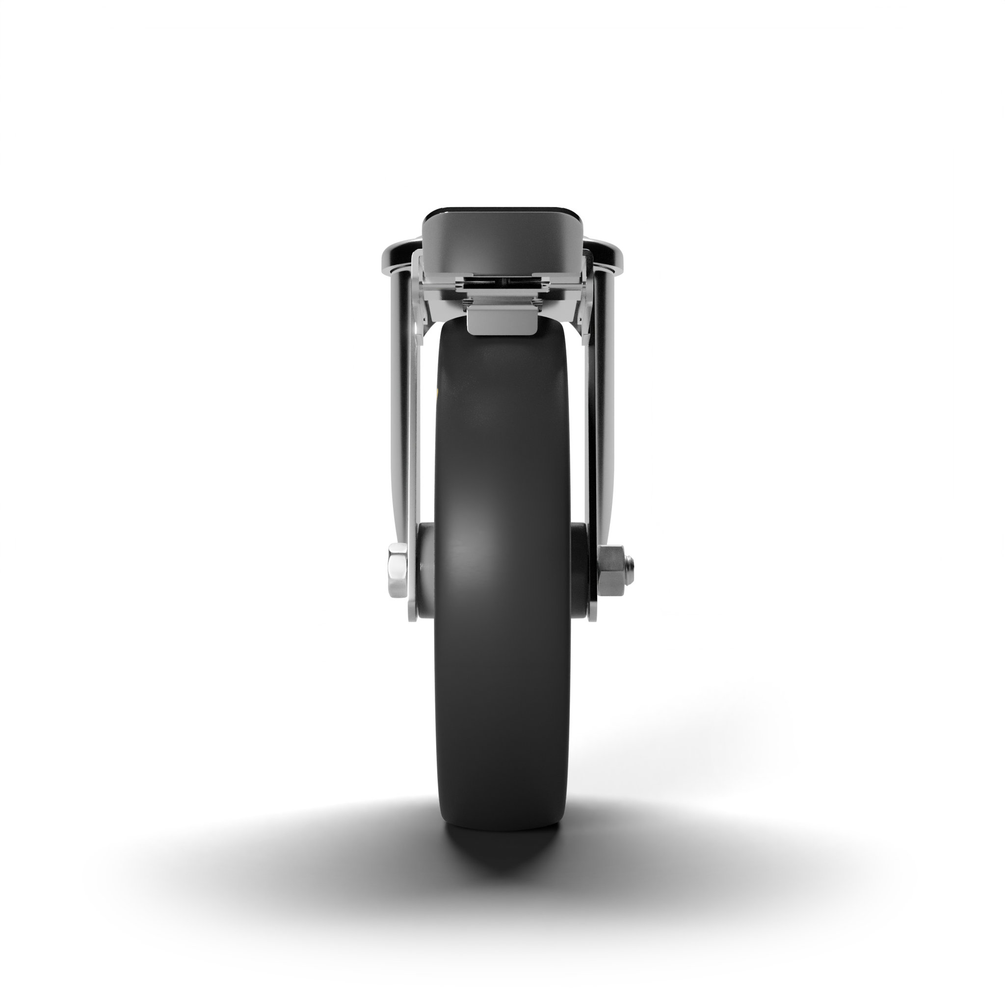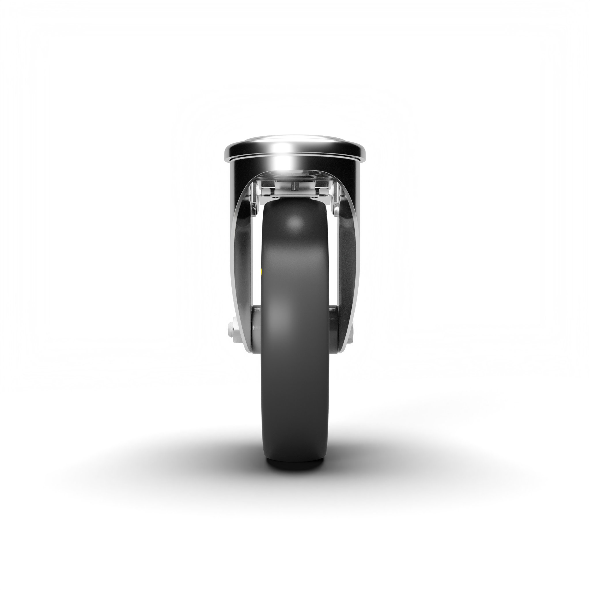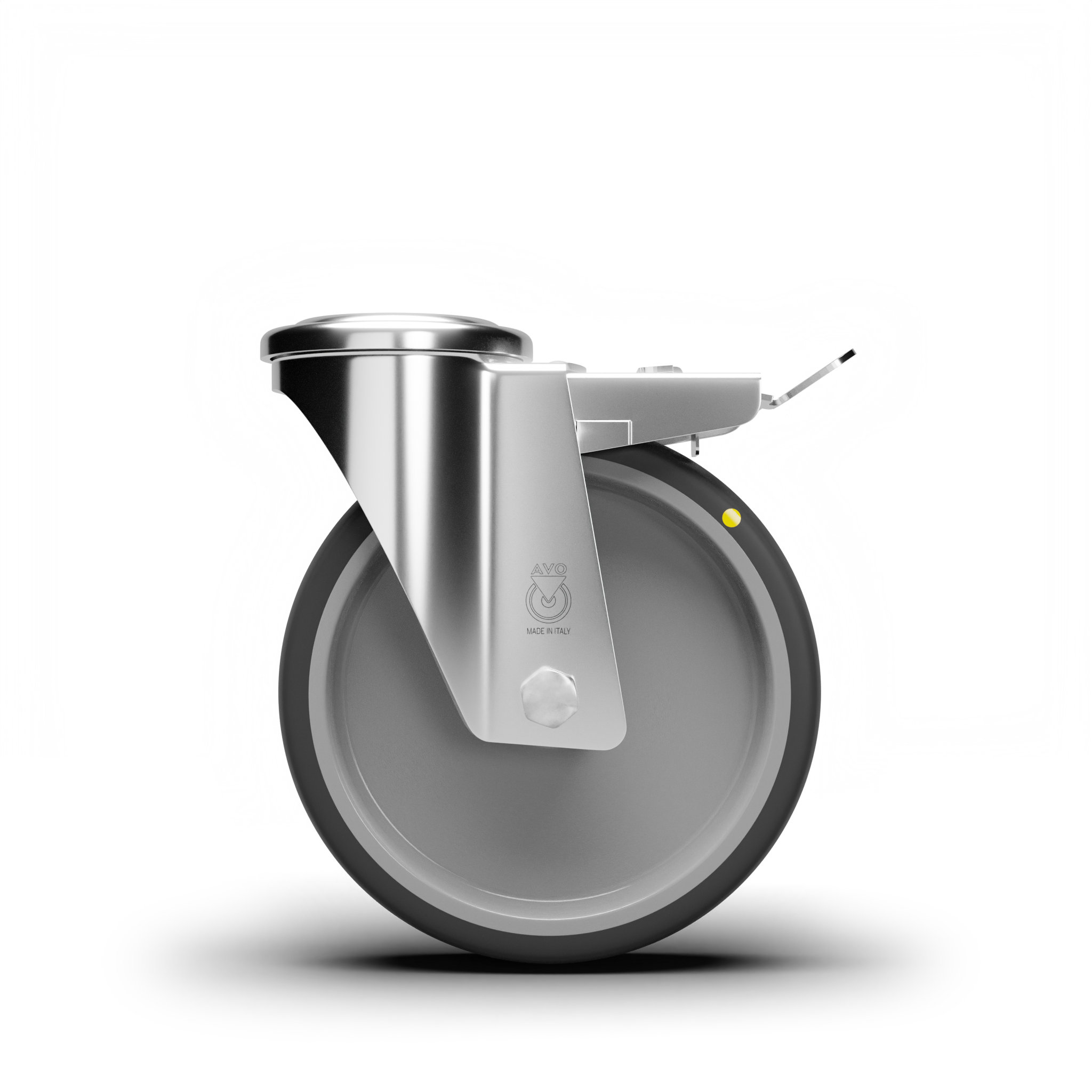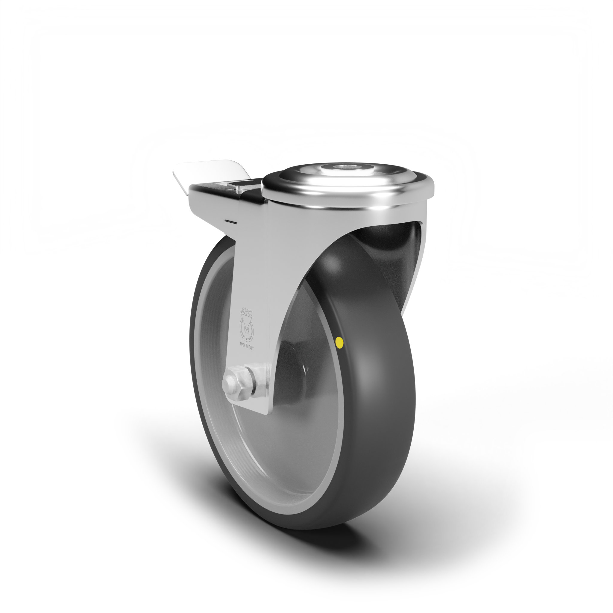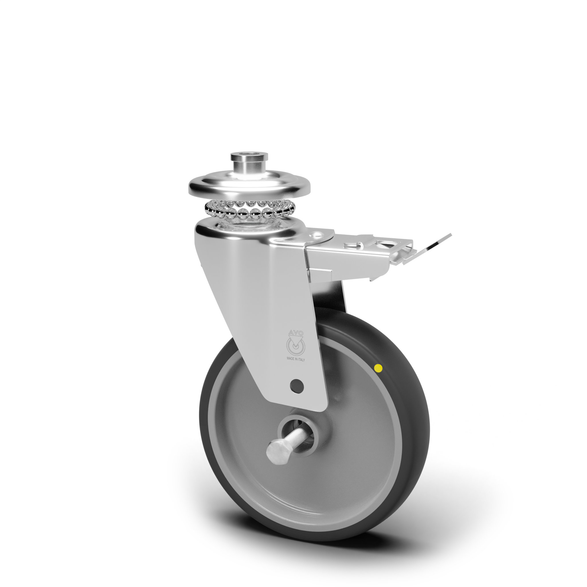 In acciaio stampato zinco-cromato rotante su doppia corona di sfere, con foro e freno anteriore. Assemblaggio con dado autobloccante.