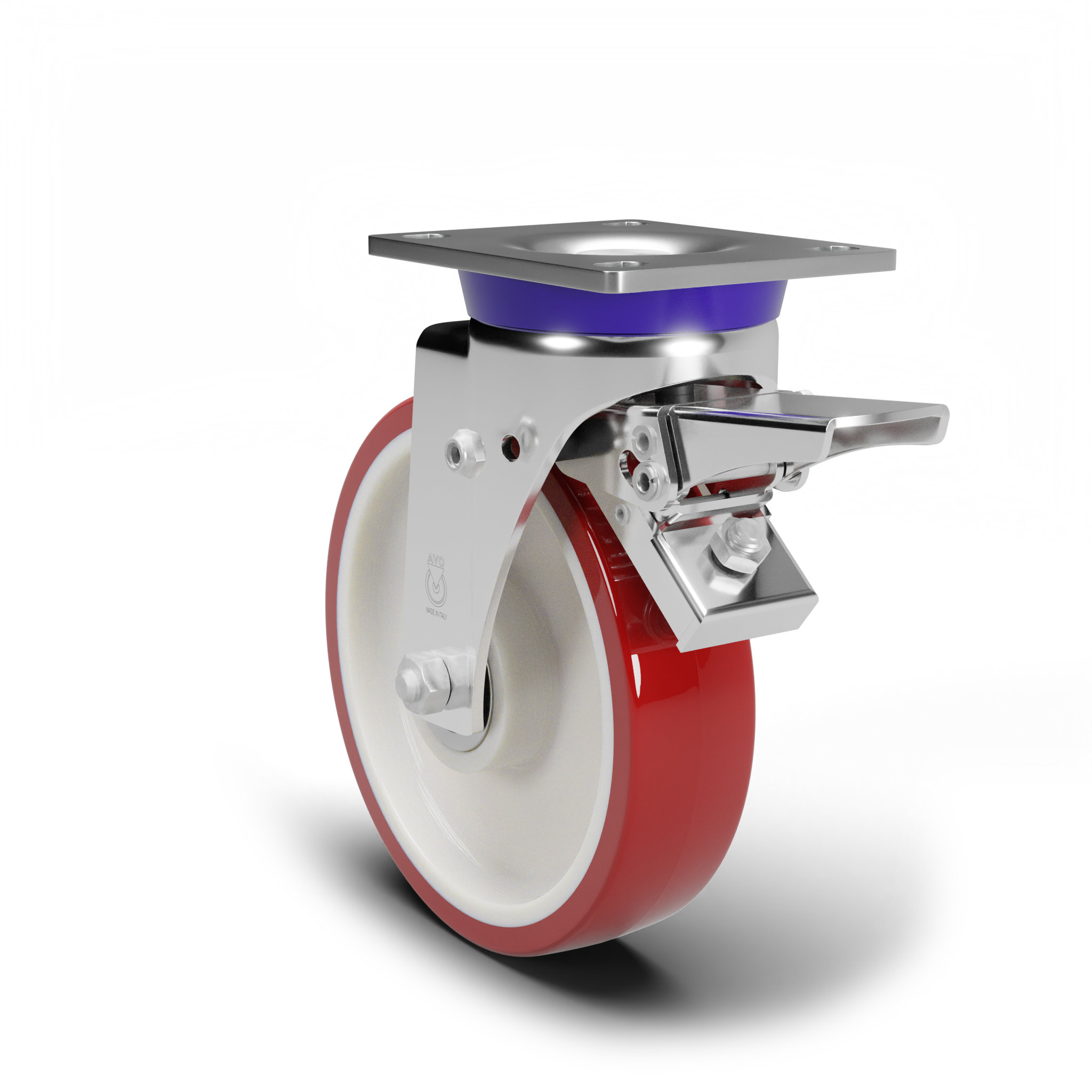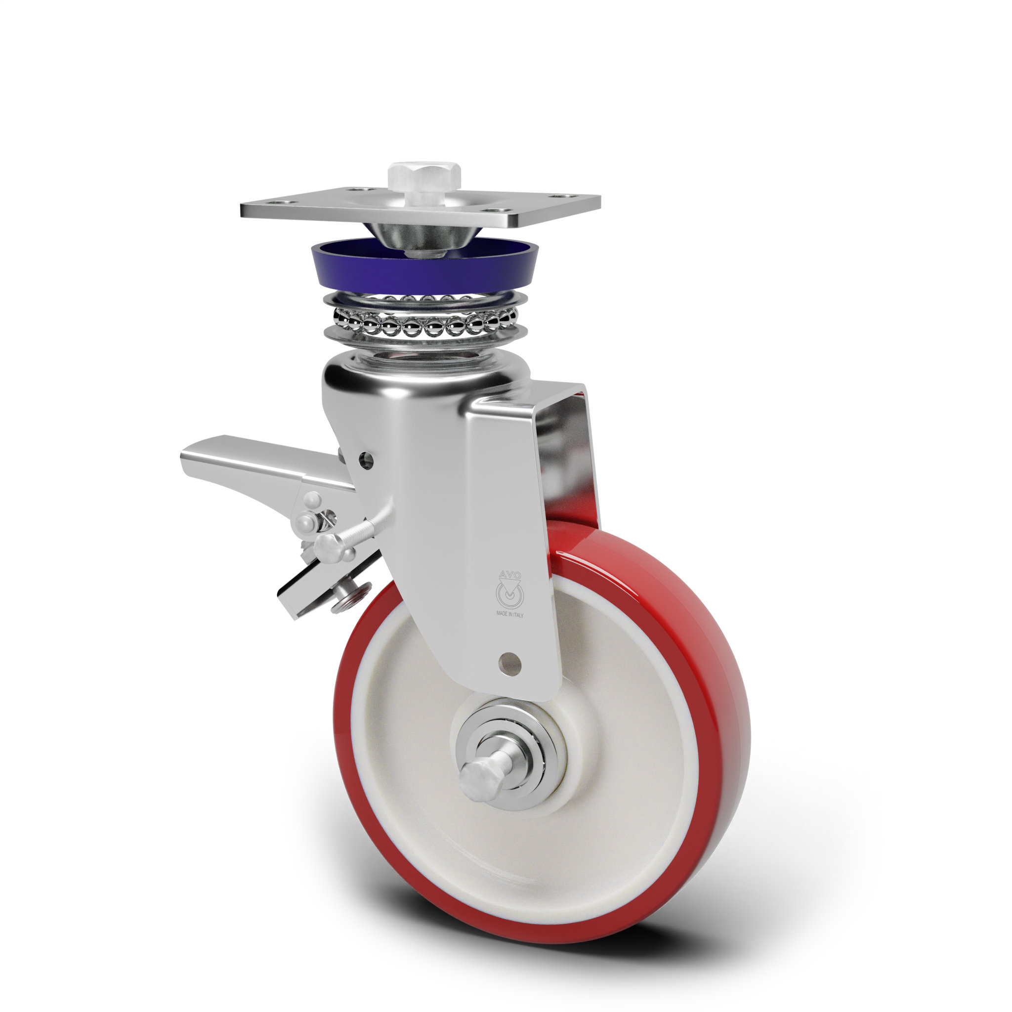 In acciaio INOX AISI 304 rotante su doppia corona di sfere INOX AISI 420, con piastra e freno posteriore. Anello parapolvere sul giro di sfere.